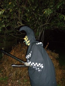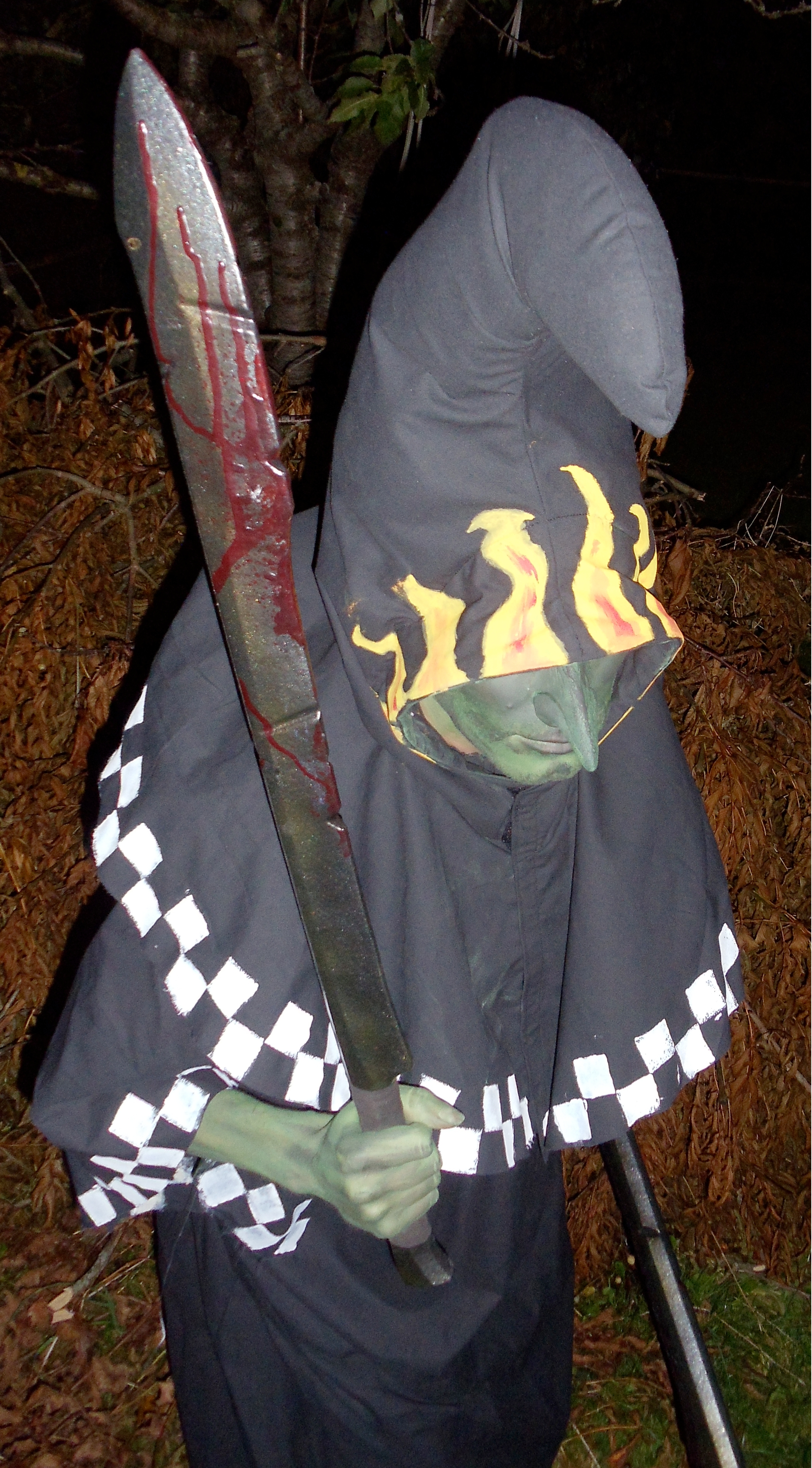 Vi (ok, det er løgn, det er Kogles rare kone ) har for det første lavet en syguide til et basis Mørkegoblin dress, det kan ses herunder. Kostymet har kostet 250kr inkl alt, det være sig nåle, tråd, bånd også videre. Det kan også ses at kogle har været nede i sin kælder og finde lidt farver frem, så der både er kommet tern og tunger på. Der er bla. brugt almindeligt akryl maling, det virker fint til småting som her. Næsen er købt ved den lokale latex pusher, basis dragten er tiltænkt at man kan undgå ører. Vi listede os udenfor i mørket og fik zappet et par billeder mere af Kogle, de kan ses her under.