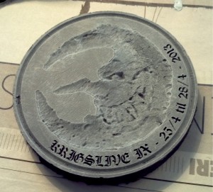Efter en længere process med at tegne og trace efter diverse andre Galemåner, en tur igennem GIMP, Inkscape og mit CAD/CAM setup kom der en første test ud. Den kan ses her til højre, den er malet sort som grundfarve og der på malet grå og tørbørstet. Der er mange ting i vejen med den, f.eks. munden træder ikke nok frem da vektorene den er skåret efter ikke havde nok plads. Texturen, et månelandskab, træder ikke tydeligt nok frem, det har noget med gøre med den måde jeg valgt at udlægge den textur toolpathen på. Slutteligt skal man ikke hæfte sig i bemalingen, det gik rasende hurtigt da jeg havde et billede jeg skulle have ud af døren.